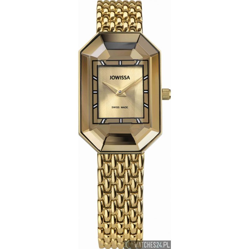 Pozłacany model Jowissa Facet J8.056.S Swiss Made to elegancki biżuteryjny zegarek szwajcarski dla kobiet, który przyciąga uwagę charakterystycznym designem. Ośmiokątna złota koperta 19.5 mm, szkło fasetowane i elegancka złota tarcza tworzą biżuteryjny efekt, dzięki czemu czasomierz doskonale sprawdzi się jako stylowy zegarek damski do codziennych i eleganckich stylizacji.